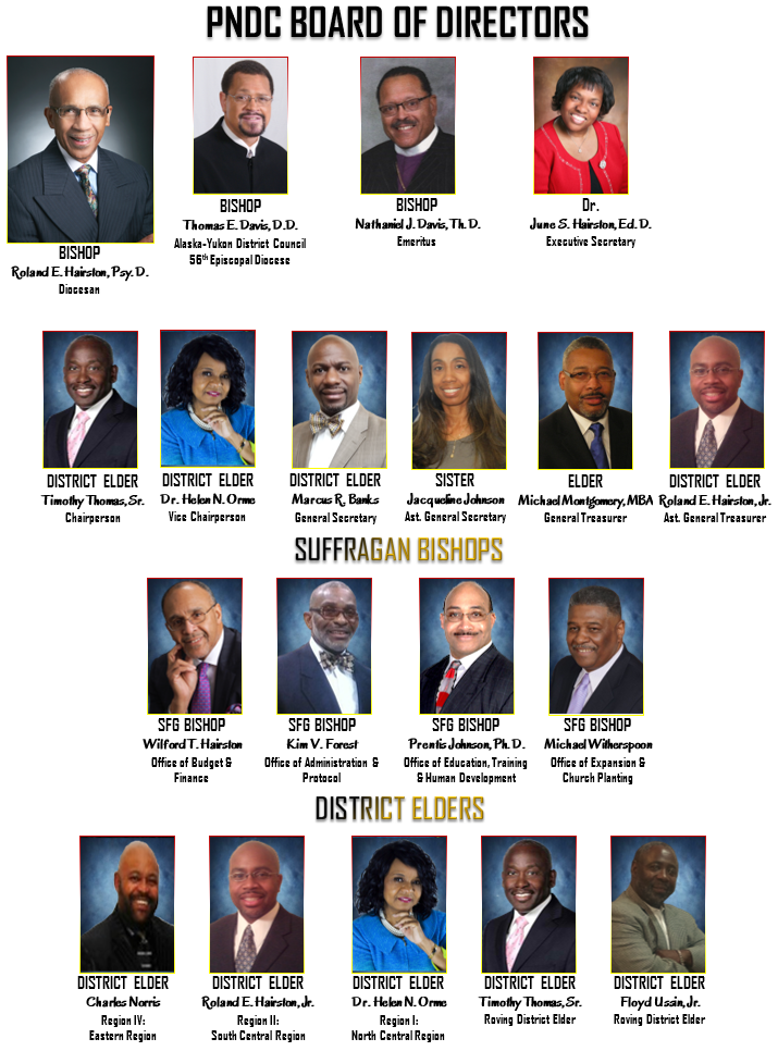 | District Elder Timothy Thomas, Sr., Chairperson ∙ District Elder Helen Orme, Vice Chairlady District Elder Marcus R. Banks, General Secretary ∙ Sister Jacqueline Johnson, Assistant General Secretary Elder Michael Montgomery, General Treasurer ∙ District Elder Roland E. Hairston, Jr., Assistant General Treasurer |